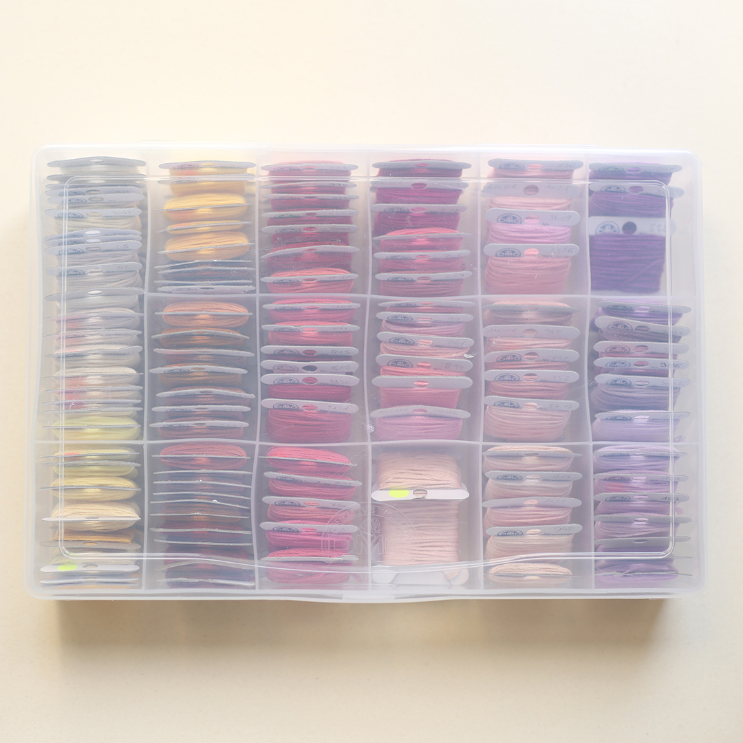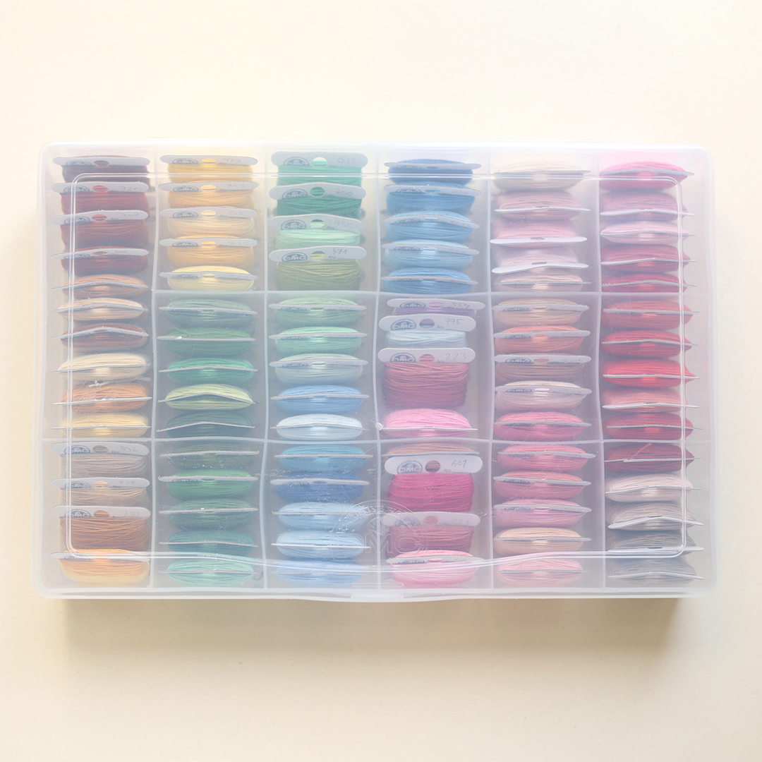 DMC Aufbewahrungsbox für Stickgarn mit 108 Fächern – inklusive 50 Garnwickelkartons – für Stickgarn-Aufbewahrung. Transparent, stapelbar – perfekt für Sticken, Visible Mending, Cross Stitch.