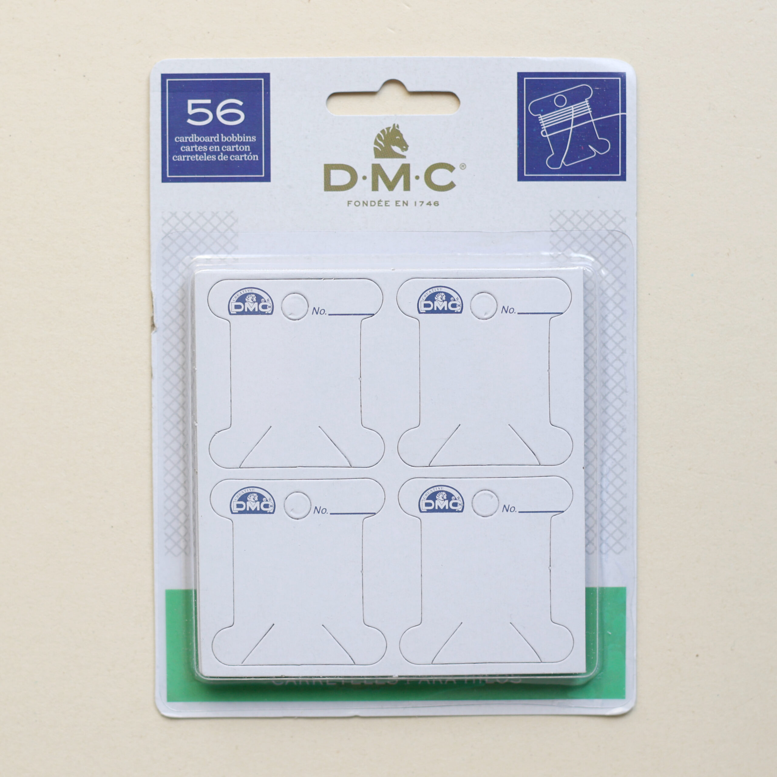 DMC Garnwickelkarten (Bobbins) sind flache Karton-Kärtchen zum sauberen Aufwickeln deiner Stickgarn-Döckchen. Mit 56 Stück in der Packung hältst du deine DMC Mouliné-Fäden knotenfrei sortiert – perfekt für Sticken und Visible Mending-Projekte.