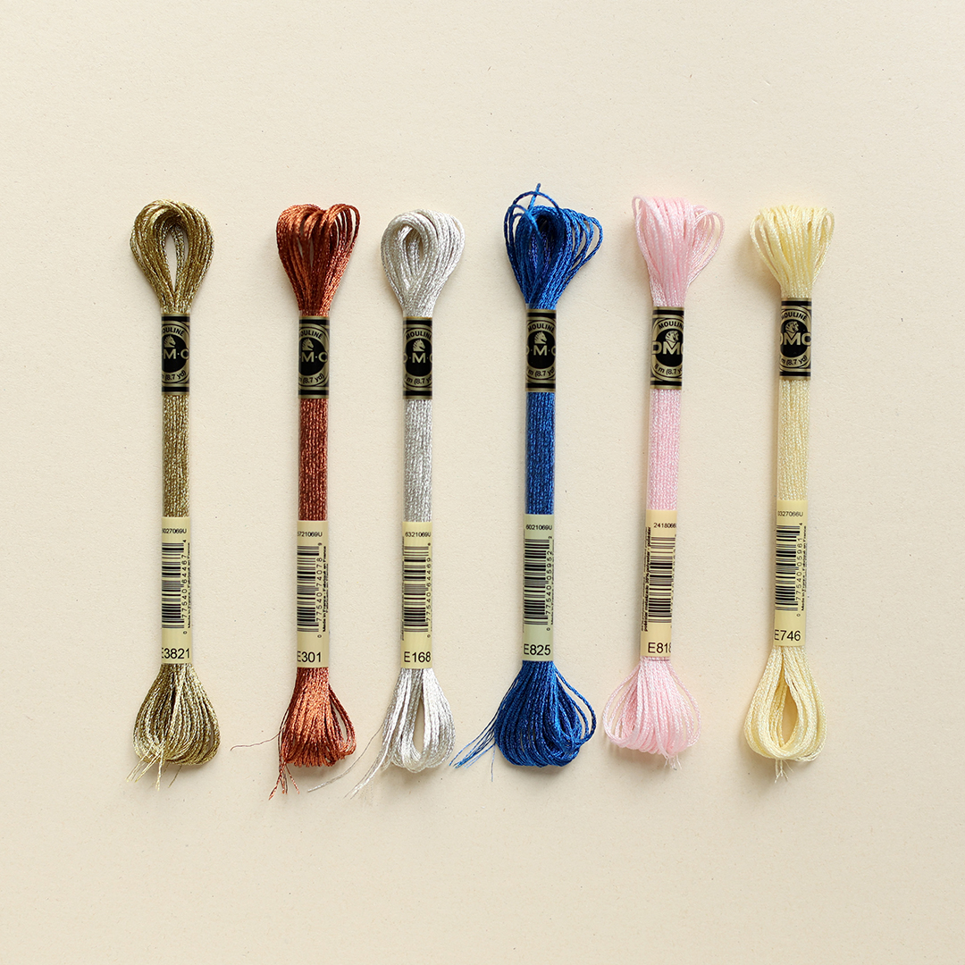 | DMC Mouliné Light Effects | E168 — Silber, E301 — Kupfer, E3821 — Gold, E746 — Gelb, E818 — Rosa, E825 — Blau |