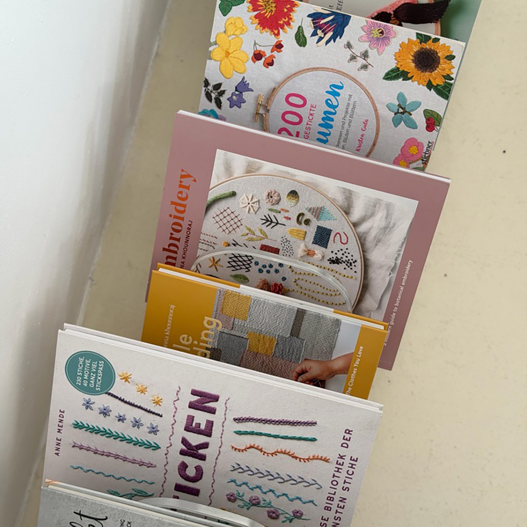Du lernst die wichtigsten Stiche direkt am Probestoff kennen. Anschließend gestaltest du dein eigenes Motiv oder wählst eine Vorlage aus unserem Workbook. Danach überträgst du dein Design auf ein von dir mitgebrachtes Kleidungsstück und stickst los! Ob Initialen, florale Muster oder kreative Mini-Illustrationen – mit ein paar einfachen Techniken wird aus jedem Textil ein ganz persönliches Lieblingsstück. Lass dich jetzt schon von unserem Moodboard inspirieren.
